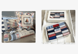 In het Cosy by Jet boek (klik) vind je stapels leuke quiltpatronen. Zowel grote quilts als dit soort leuke kussens. We hebben een bijpassend snoepdoosje